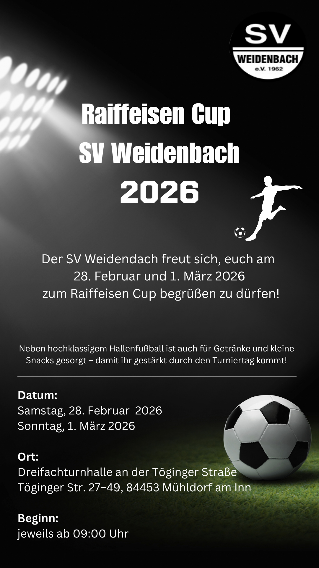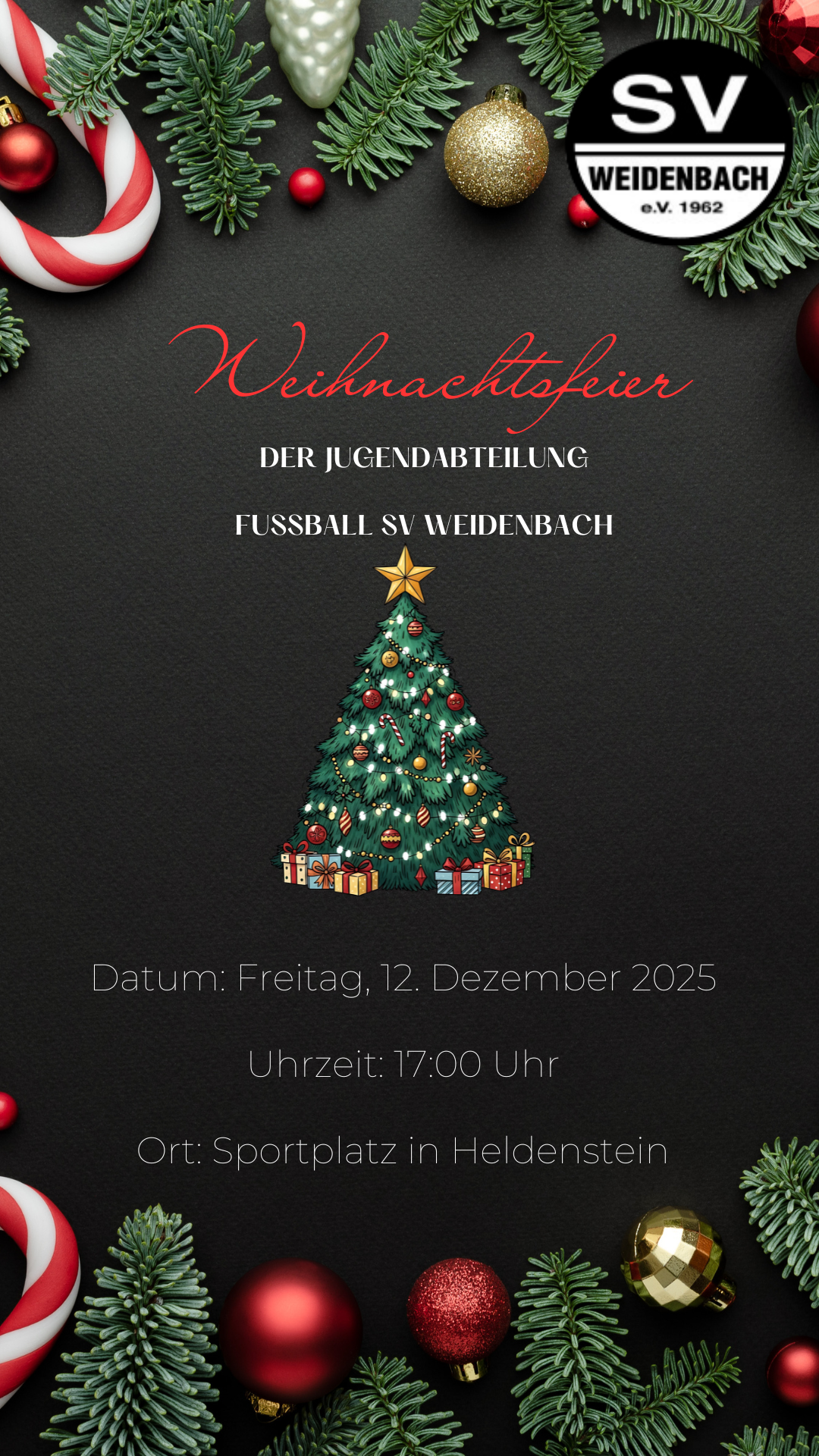 Sportplatz Heldenstein Wiesenweg 10, Heldenstein, Bayern, GermanyLiebe Spielerinnen und Spieler, liebe Eltern, wir laden euch herzlich zur diesjährigen Weihnachtsfeier der Jugendabteilung Fußball des SV Weidenbach ein! Gemeinsam möchten wir das Jahr 2025 gemütlich ausklingen lassen, auf unsere Erfolge anstoßen und einfach eine schöne Zeit miteinander verbringen. Datum: Freitag, 12. Dezember 2025⏰ Uhrzeit: 17:00 UhrOrt: Sportplatz in Heldenstein Für Essen, Getränke und …