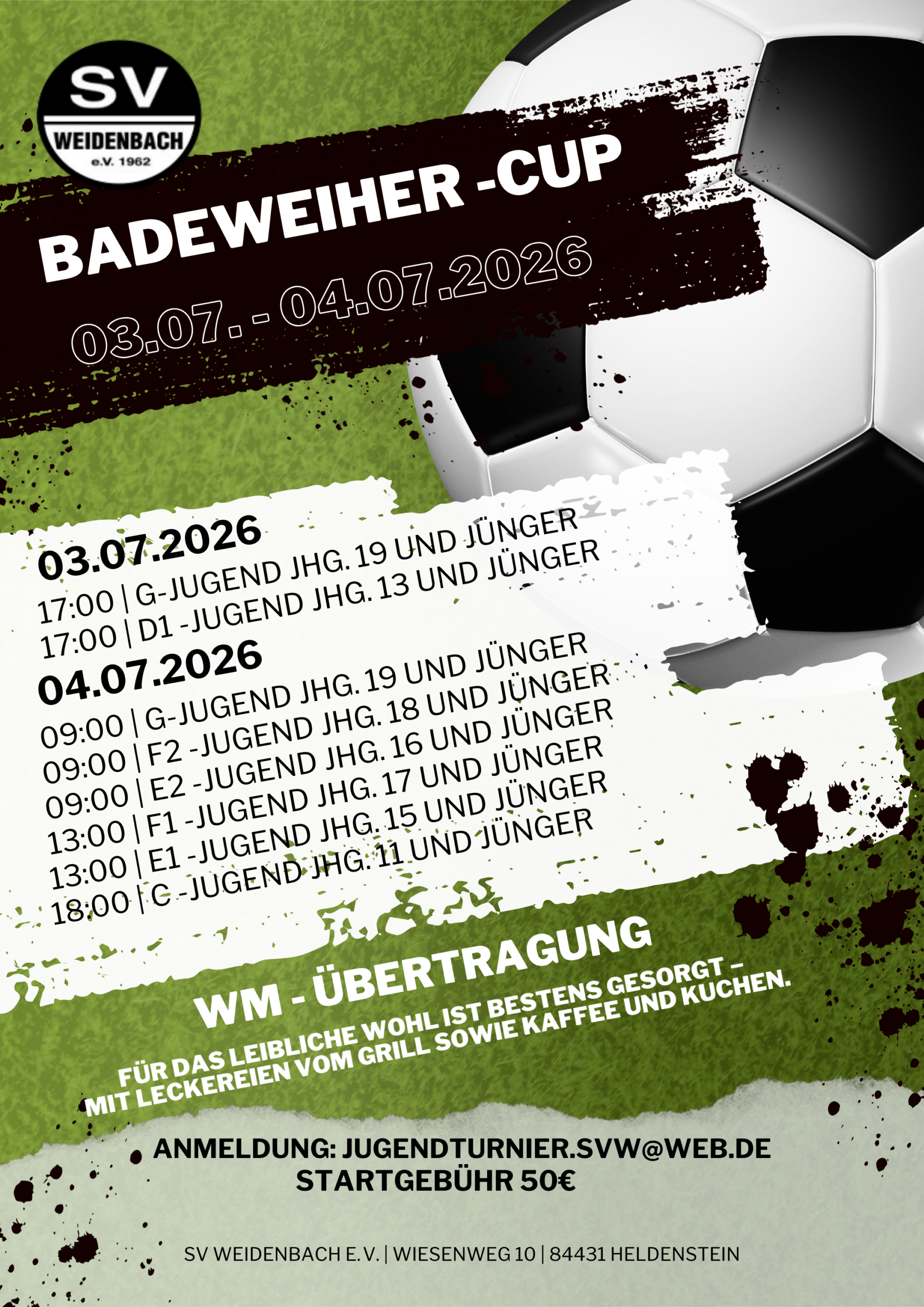 Liebe Fußballfreunde, liebe Eltern und Unterstützer des Jugendfußballs, am 03.07.2026 und 04.07.2026 ist es endlich soweit: Der Badeweiher Cup 2026 lädt wieder zu einem besonderen Fußballerlebnis auf den Sportplatz Heldenstein …